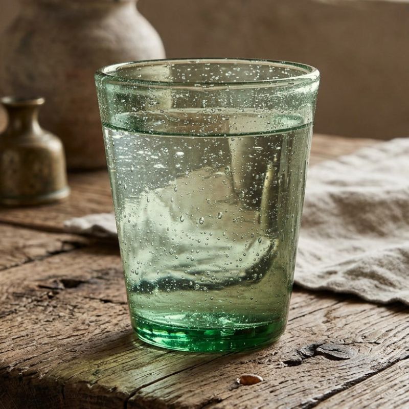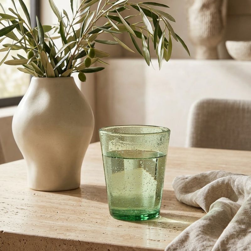 Le verre CABU en verre bullé séduit par son design simple et son vert profond et vif.