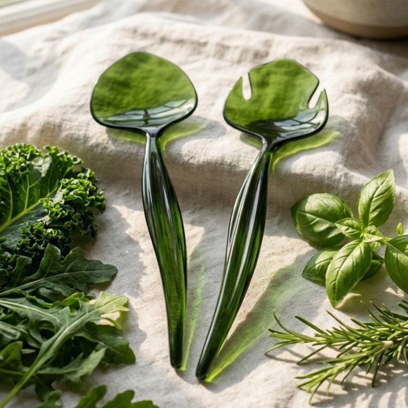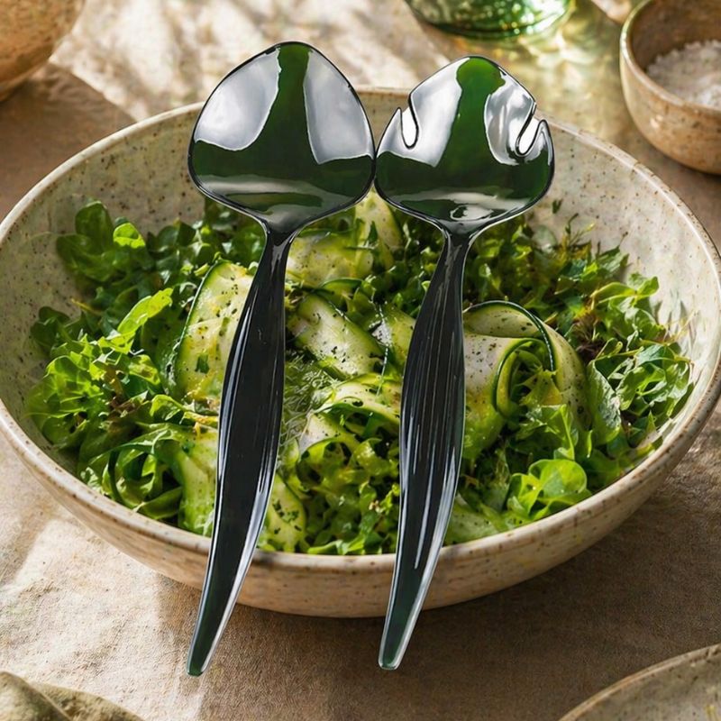 Les couverts à salade verts DENISE apportent une touche originale à votre table avec leur design en forme de feuilles.