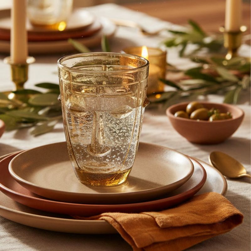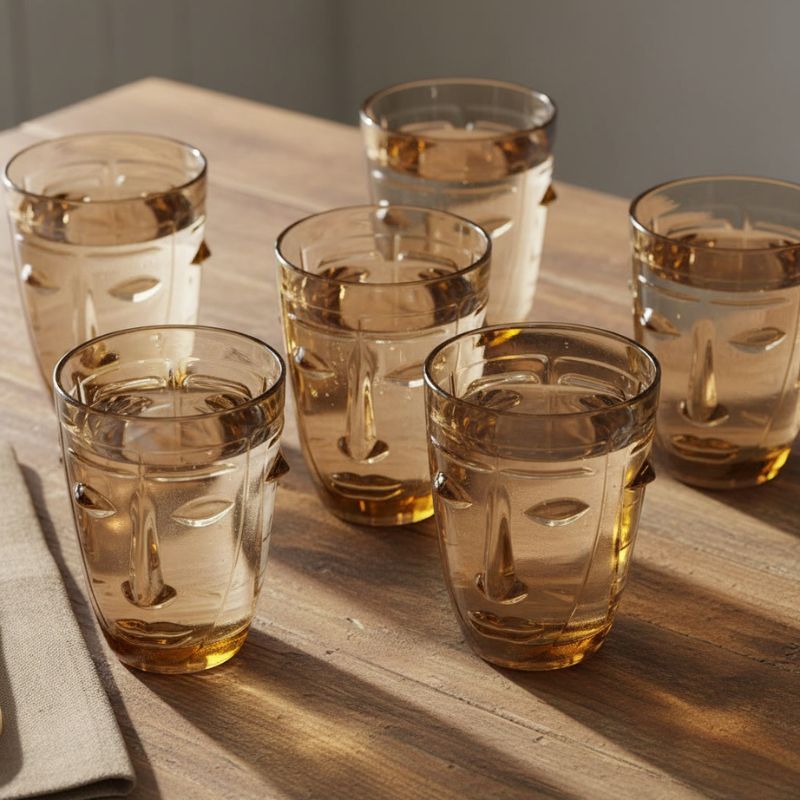 Sa teinte ambre chaleureuse donne de la profondeur à votre service. Idéal pour l’eau, les jus ou vos boissons fraîches préférées, ce verre visage ambre ajoute une présence décorative forte à votre quotidien.
